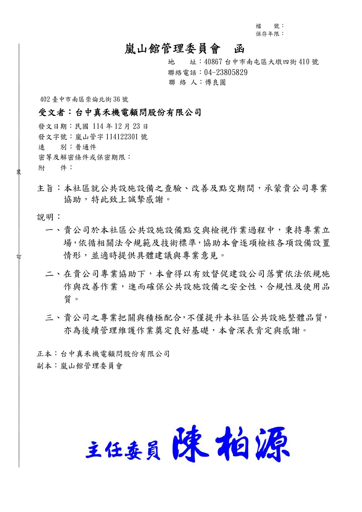 感謝台中佳成公園 iPark委員會來函鼓勵